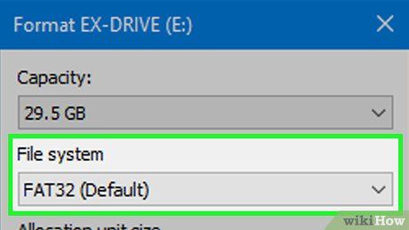 Định dạng USB với FAT32 hoặc exFAT. Khi định dạng USB, nhấp vào Hệ thống tập tin (File system), sau đó chọn FAT32 hoặc exFAT từ danh sách.