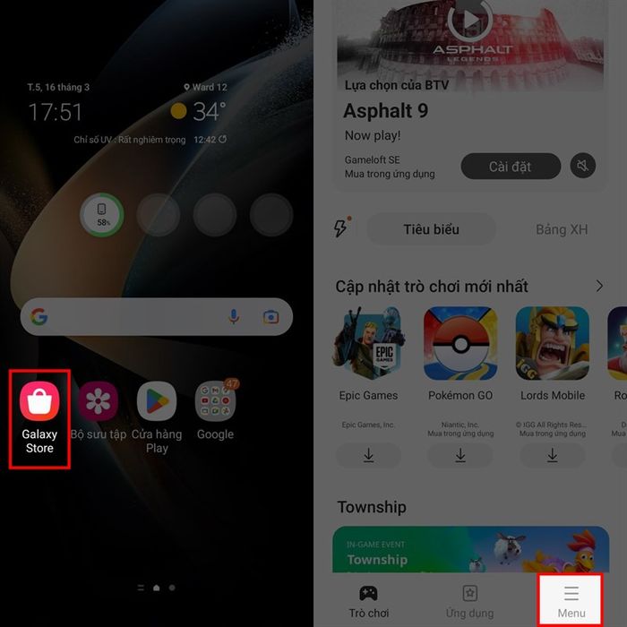 Bước 1: Truy cập cửa hàng ứng dụng mặc định trên điện thoại Samsung - Galaxy Store. Chọn Menu ở góc dưới bên phải màn hình, thay vì tìm kiếm tên ứng dụng trên thanh tìm kiếm.