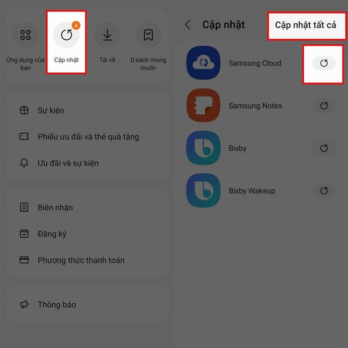 Bước 2: Tại Cập nhật, chọn ứng dụng cần cập nhật để nhấn biểu tượng cập nhật phía sau hoặc cập nhật tất cả để đưa chúng lên phiên bản mới nhất.