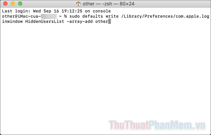 - Copy và dán dòng lệnh sau vào Terminal, đảm bảo bạn thay đổi “username” thành Tên tài khoản mà bạn vừa ghi nhớ.