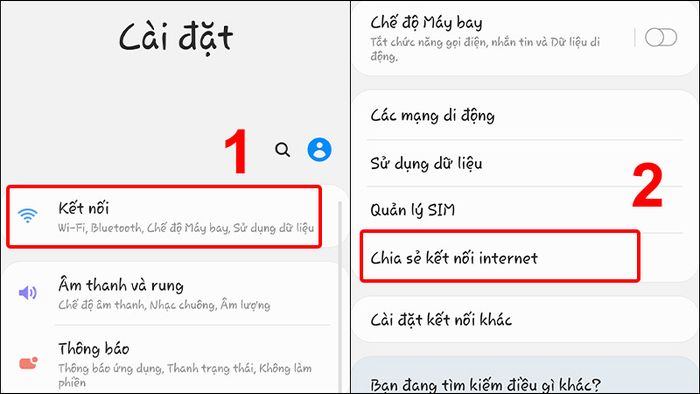 - Bước 1: Mở Cài đặt, chọn Kết nối, và nhấn vào Chia sẻ kết nối internet.