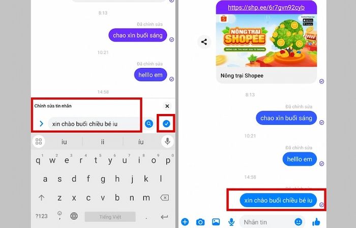 Bước 3: Nhập nội dung tin nhắn sau khi sửa, nhấn dấu tích xanh để hoàn tất. Cả bạn và đối phương sẽ nhận được thông báo tin nhắn đã được chỉnh sửa.