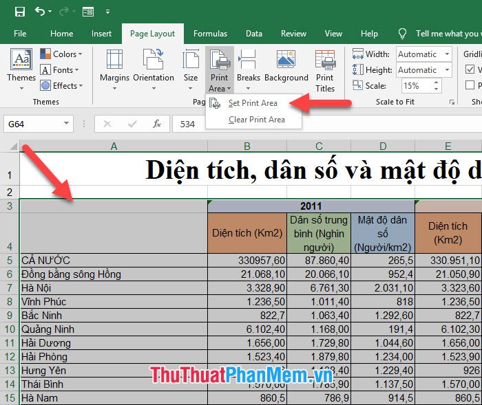Bước tiếp theo là mở tab Page Layout và chọn Page Setup. Nhấn vào biểu tượng Print Area và chọn Set Print Area.