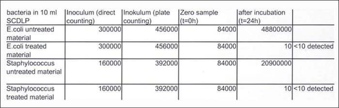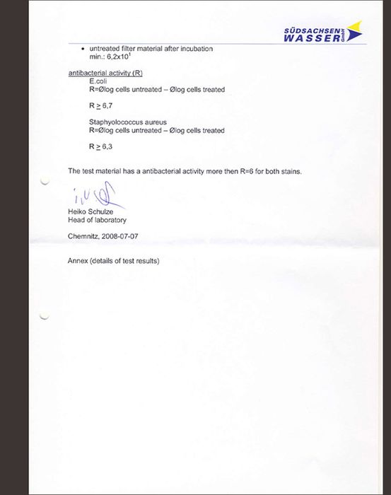 Sự kiểm nghiệm của Südsachsen Wasser GmbH (gọi tắt là SWG * Đức) dựa trên tiêu chuẩn ISO 22196:2007, công bố ngày 07.07.2008, chứng minh rằng chiếu ánh sáng xanh vào tấm lọc tinh thể bạc trong vòng 24h có khả năng tiêu diệt tới 99,99% vi khuẩn.