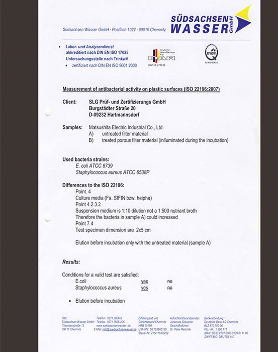 Để chứng minh độ hiệu quả trong việc tiêu diệt vi khuẩn, tập đoàn Südsachsen Wasser GmbH (gọi tắt là SWG) *1 tại Đức đã kiểm nghiệm công nghệ Blue Ag+ thông qua nhiều thí nghiệm. SWG là một tập đoàn đa dạng cung cấp các dịch vụ đo lường, kiểm tra, phân tích mẫu nước, chất thải và môi trường, sử dụng các phương pháp hiện đại.
