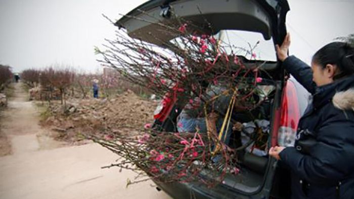 Đối với những gia đình mang theo cây đào, cây quất về quê ăn Tết, việc sử dụng dây buộc là rất cần thiết. Nếu cây quá lớn, bạn nên nhờ người khác buộc gọn lại các cành, sau đó đặt một lớp bìa cát-tông trên trần xe trước khi buộc chặt. Điều này giúp tránh trầy sơn xe.