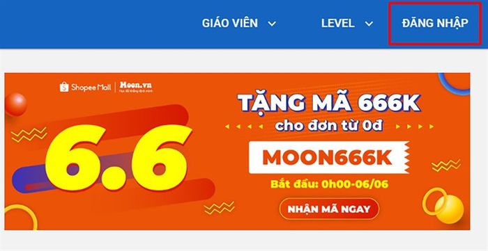 Bước 1: Truy cập vào đường Liên kết bên dưới để vào trang chủ của Moon > Nhấn Đăng nhập ở góc phải trên màn hình, sau đó bạn có thể chọn cách đăng nhập theo sở thích của mình.