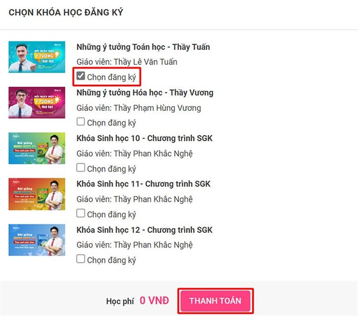 Bước 3: Chọn môn học và giáo viên mà bạn muốn (Ở đây tôi chọn Thầy Tuấn nhé).