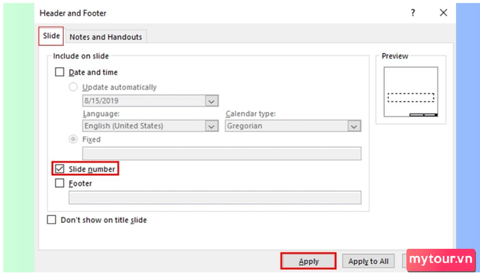 Bước 6: Nhấn Apply to All khi muốn chèn số trang cho tất cả Slide trong trình chiếu.
