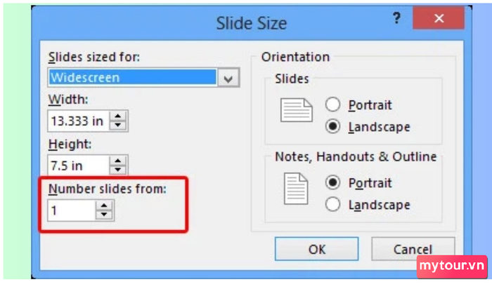 Bước 7: Trong trường hợp bạn muốn đánh số thứ tự mà không bắt đầu từ số 1, chọn Design -> Slide Size (trong nhóm Customize) -> Custom Slide Size. Tại mục Number slides from, nhập số bạn muốn bắt đầu đánh số thứ tự trong Slide.