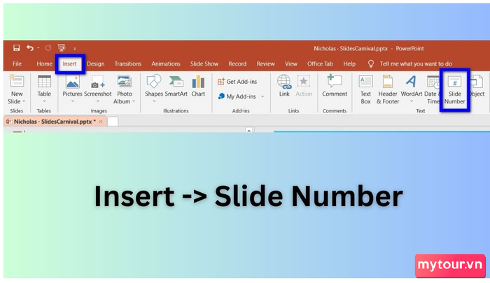 Bước 2: Điều hướng đến Tab Chèn và lựa chọn Slide Number.