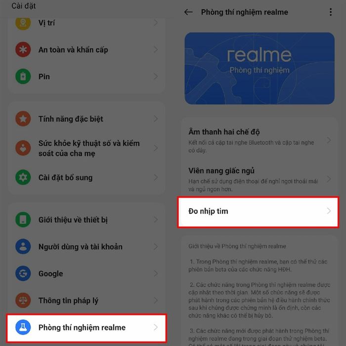 Bước 1: Kiểm tra tính năng tại Cài đặt > Phong thí nghiệm realme > Đo nhịp tim. Nếu có, bạn có thể tiếp tục.