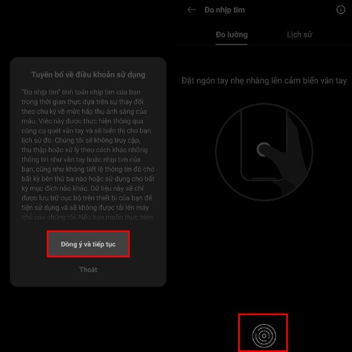Bước 2: Đọc và đồng ý với điều khoản sử dụng, sau đó đặt ngón tay lên cảm biến vân tay (phía dưới màn hình) để bắt đầu đo nhịp tim.