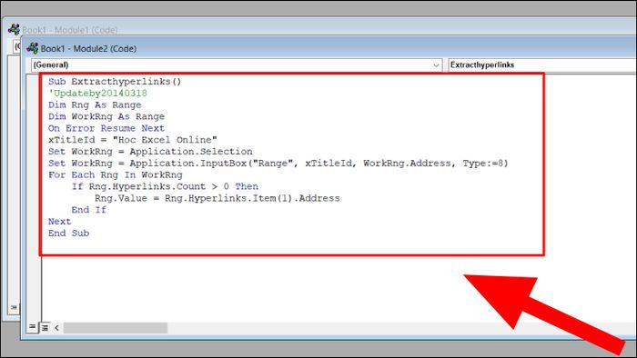 Sub Extracthyperlinks() 'Updateby20140318 Dim Rng As Range Dim WorkRng As Range On Error Resume Next xTitleId = "Hoc Excel Online" Set WorkRng = Application.Selection Set WorkRng = Application.InputBox("Range", xTitleId, WorkRng.Address, Type:=8) For Each Rng In WorkRng If Rng.Hyperlinks.Count > 0 Then Rng.Value = Rng.Hyperlinks.Item(1).Address End If Next End Sub |