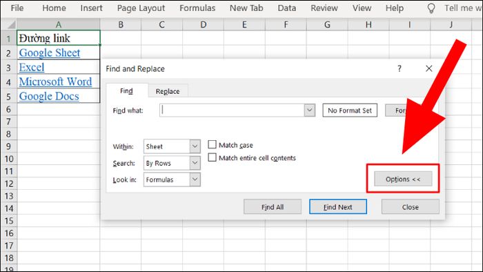 Bước 1: Nhấn tổ hợp phím Ctrl + F để mở hộp thoại Find and Replace > Chọn Options.