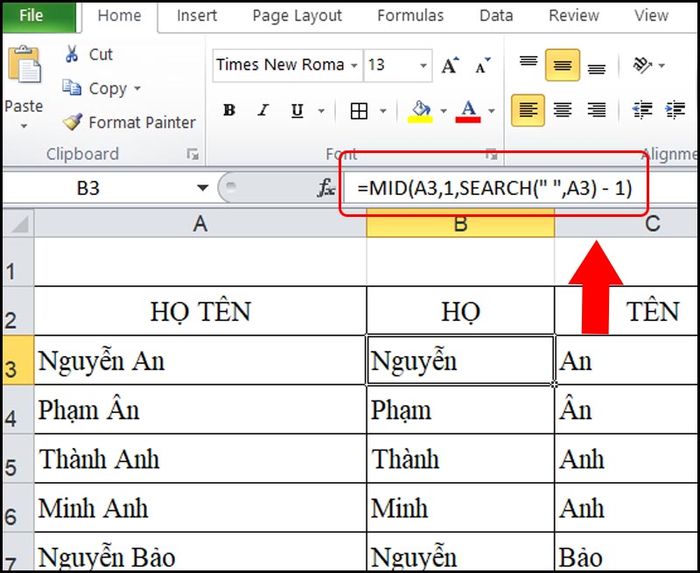 Cách sử dụng công thức hàm MID để tách họ