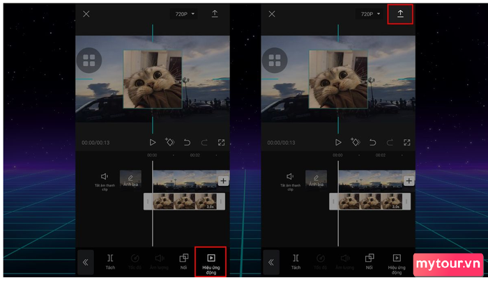 Bước 4: Sau khi đã chỉnh sửa, thêm hiệu ứng và đạt được kết quả mong muốn, nhấn biểu tượng mũi tên ở góc trên bên phải để lưu video. Bạn cũng có thể chia sẻ tác phẩm trên các mạng xã hội như Facebook, Instagram, và nhiều nền tảng khác để chia sẻ niềm vui sáng tạo của bạn với mọi người.