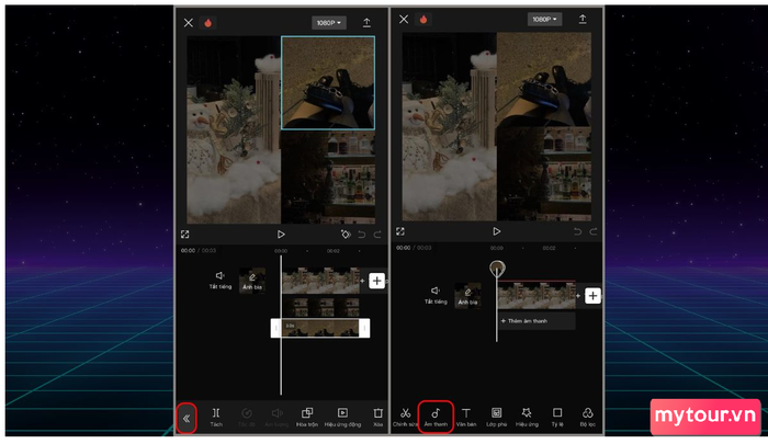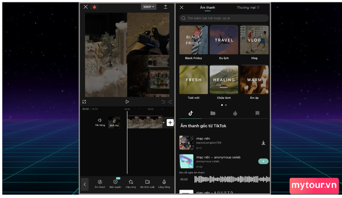 Bước 4: Điều Chỉnh Âm Thanh - Chọn nguồn âm thanh bạn muốn sử dụng, có thể là nhạc nền hoặc bất kỳ đoạn âm thanh khác. Chọn đoạn nhạc và điều chỉnh thời gian xuất hiện của nó theo video.