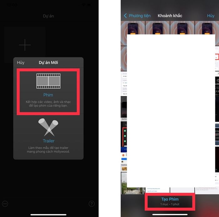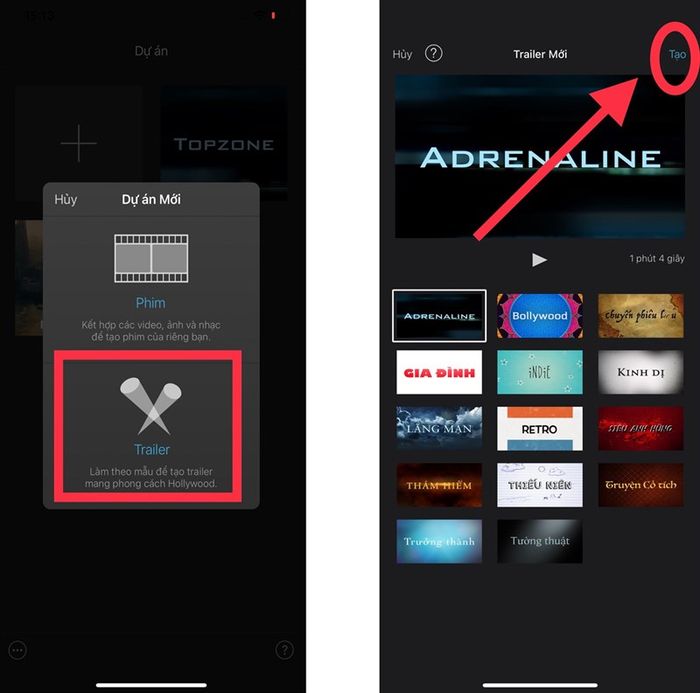 - Trong chế độ Trailer: Chọn một chủ đề trailer, sau đó thực hiện theo mẫu với các khung hình sáng tạo của bạn.