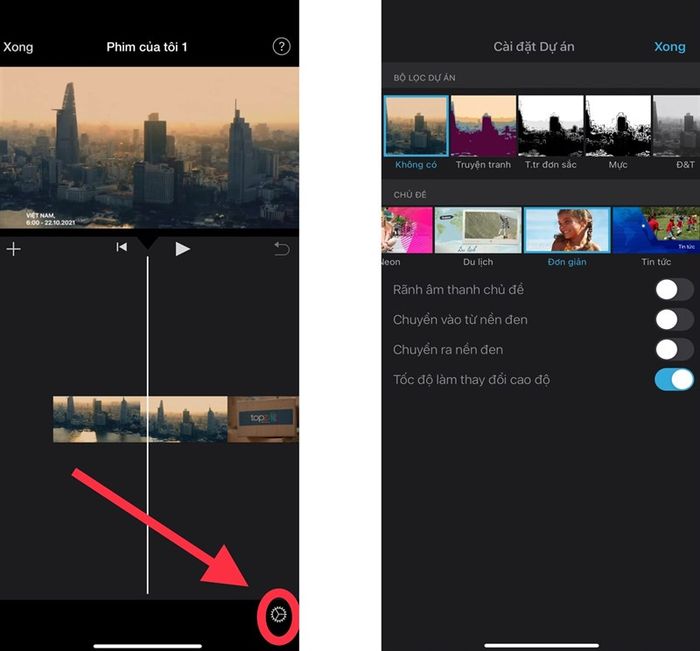 - Trong chế độ Phim: Chọn video cần ghép, sau đó chọn Tạo phim. Thực hiện chỉnh sửa với các tùy chọn cơ bản như: bộ lọc video, chủ đề video (Du lịch, Tin tức, Cổ điển, ...), thêm nhạc hoặc âm nhạc yêu thích, tạo phần nền đen ở đầu hoặc cuối video, điều chỉnh tốc độ video.