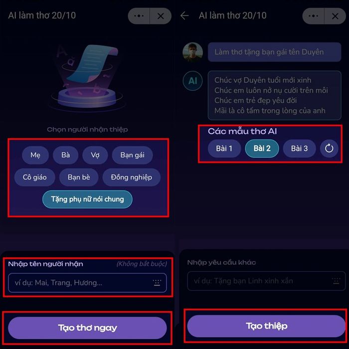 Đặc điểm 2: Nếu bạn muốn tạo thơ AI, hãy chọn đối tượng và nhập tên người nhận. Sau đó, nhấn Tạo thơ ngay dưới màn hình. Chờ AI hoàn thiện và chọn từ 3 mẫu thơ hoặc tự nhập ý của bạn. Khi đã có bài thơ, chọn Tạo thiệp.