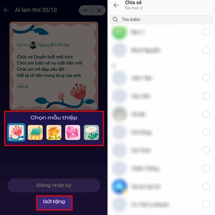 Đặc điểm 3: Tại giao diện tiếp theo, chọn một mẫu thiệp từ 4 mẫu trên và nhấn Gửi tặng. Cuối cùng, chọn liên lạc và nhấn Gửi.