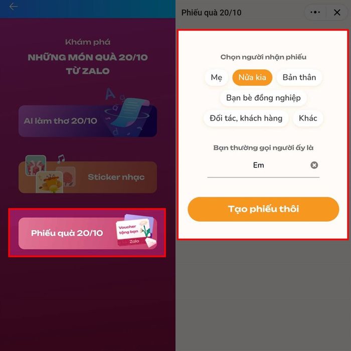 Đến với Phiếu quà 20/10, bạn tạo một phiếu quà với tên người nhận. Chọn phiếu quà 20/10 và đối tượng nhận phiếu. Nhập tên và nhấn Tạo phiếu.