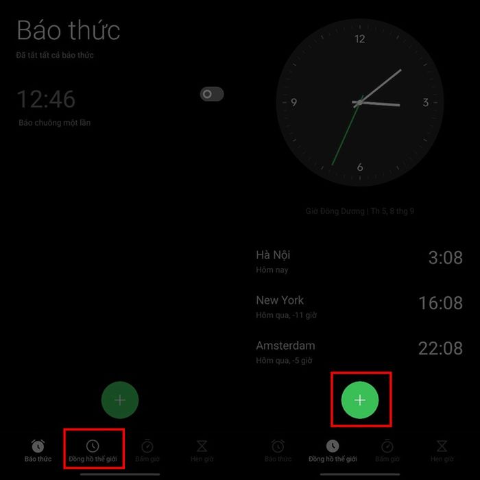 Bước 1: Dễ dàng theo dõi thời gian ở nhiều địa điểm trên thế giới ngay trên màn hình chính. Mở ứng dụng Đồng hồ và chọn Đồng hồ thế giới, sau đó ấn dấu + màu xanh phía trên màn hình.