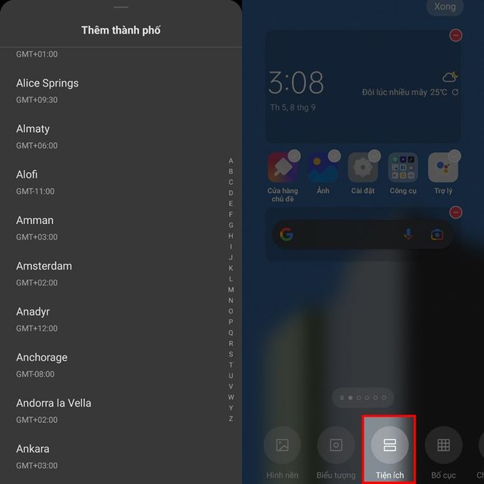 Bước 2: Chọn thành phố thứ 2, thứ 3,... muốn theo dõi và xong. Trở lại màn hình chính, ấn giữ vào vị trí trống nào đó để mở giao diện tùy chỉnh. Tiếp theo, chọn Tiện ích trong danh sách.