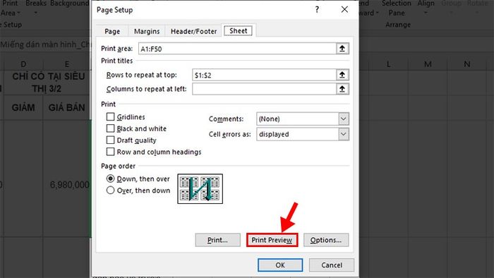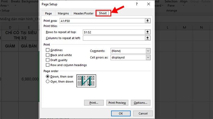 Nếu bạn muốn in lặp lại tiêu đề, nhấn vào thẻ Sheet và thiết lập nhé: