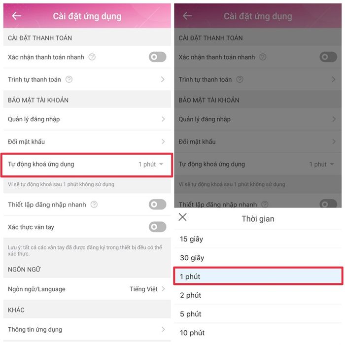Bước 3: Scroll down và chọn phần Tự động khóa ứng dụng. Sau đó, trong phần Thời gian hãy chọn thời gian tự động khóa ứng dụng sau khi không sử dụng, tối đa là 10 phút, tối thiểu là 15 giây.