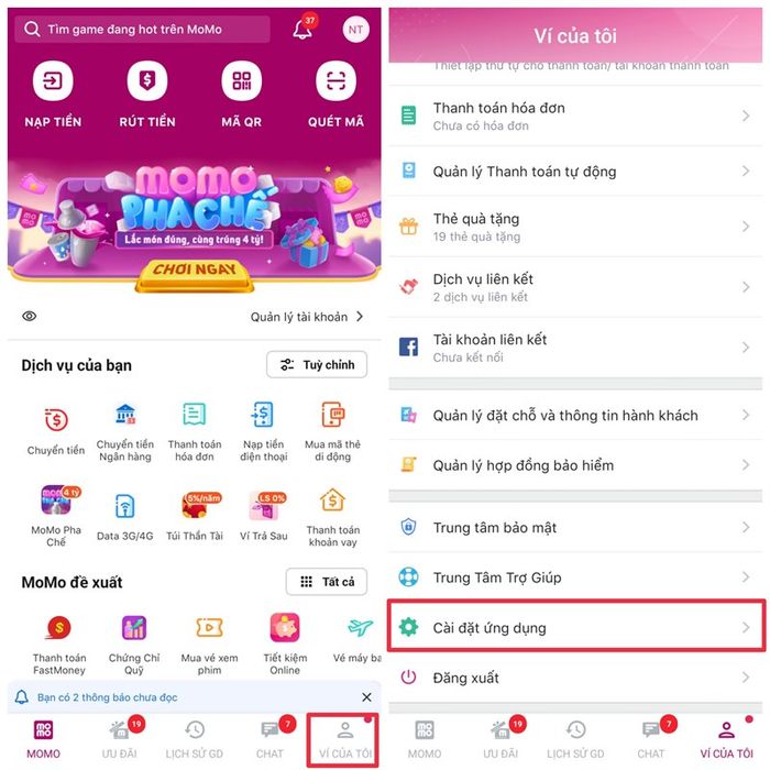 Bước 2: Mở ứng dụng MoMo và đăng nhập vào tài khoản của bạn. Trên màn hình chính, chọn Ví của tôi > Cài đặt ứng dụng.