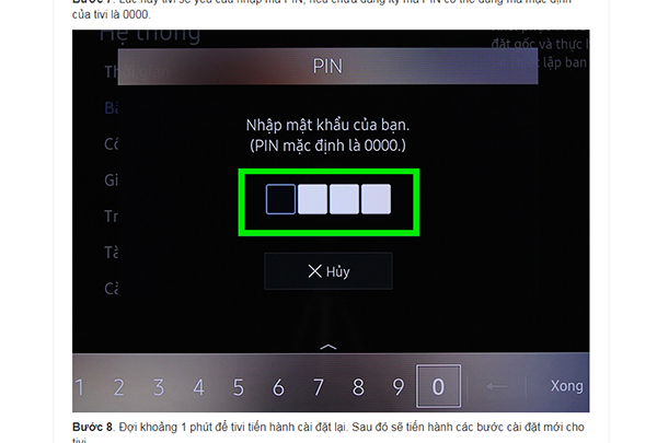 Bước 7: Sau khi chọn Có, Tivi yêu cầu nhập mã PIN (mặc định là 0000).