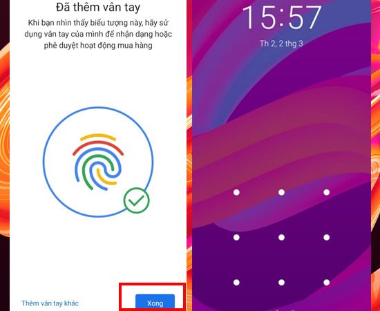 Thực hiện quét dấu vân tay cho đến khi màn hình hiển thị Đã thêm vân tay > Chọn Xong để hoàn tất quá trình.