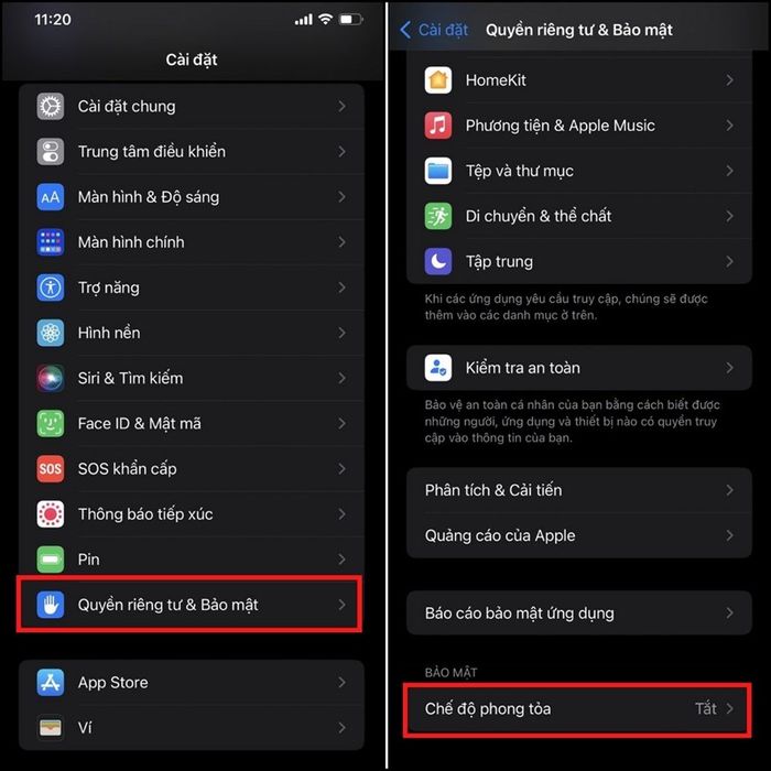 Bước 1: Truy cập Cài đặt > Quyền riêng tư & bảo mật, sau đó chọn Chế độ phong tỏa.