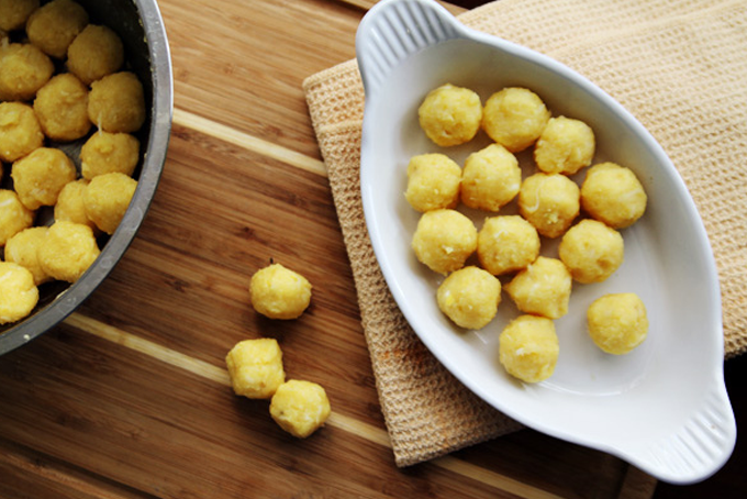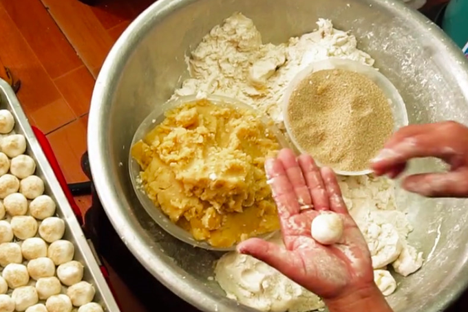 - Chia phần bột và đậu thành những viên tròn nhỏ đều nhau. Tùy vào lượng nguyên liệu đã chuẩn bị để nặn vỏ bánh và nhân bánh phù hợp. Với lượng nguyên liệu trên, bạn có thể chia thành 10 – 15 viên nhỏ.