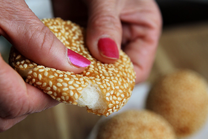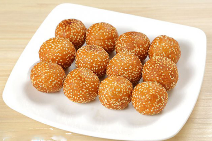 - Nắn viên bột một lần nữa để tròn và để mè bám chặt vào bánh.
