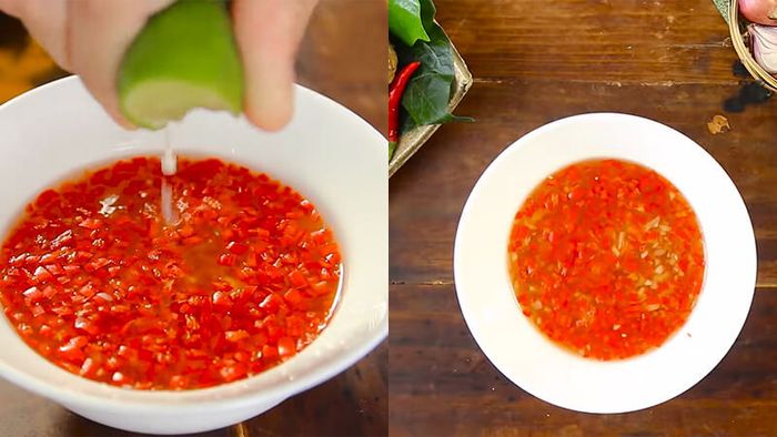 Chuẩn bị nước chấmBạn trộn vào chén 3 muỗng cà phê đường, 1 muỗng cà phê tỏi băm, 4 muỗng cà phê nước mắm, 3 muỗng cà phê nước lọc, 1 muỗng cà phê ớt băm, 2 muỗng canh nước cốt chanh, khuấy đều.