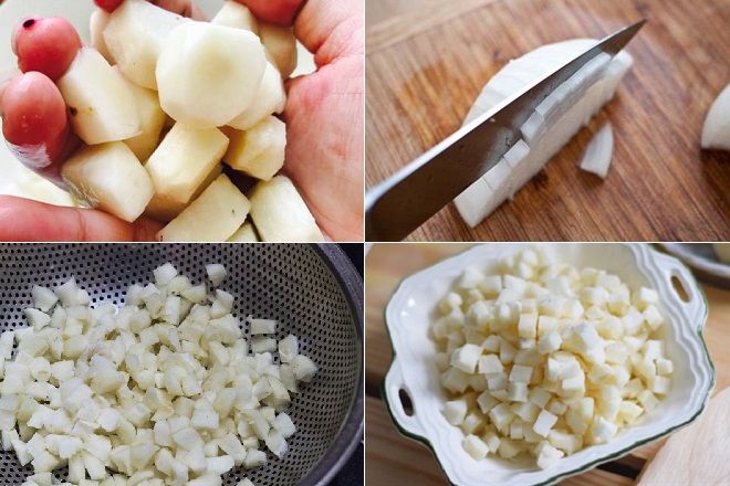 Thái củ từ thành những viên hạt lựu: 1 cm x 1 cm x 1 cm.