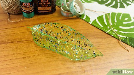 Thêm chút sắc sảo cho gân lá bằng hạt cườm hoặc kim tuyến. Phết keo xung quanh lá và/hoặc cuống lá, sau đó rắc hạt cườm hoặc kim tuyến lên. Bạn cũng có thể vẽ họa tiết bằng keo kim tuyến.