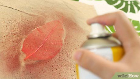 Tạo hiệu ứng ánh kim. Đặt lá lên khăn giấy và xịt một lớp mỏng sơn xịt ánh kim lên lá. Dùng nhíp để di chuyển lá ra khỏi khăn giấy và để lá khô. Lặp lại với mặt sau của lá.