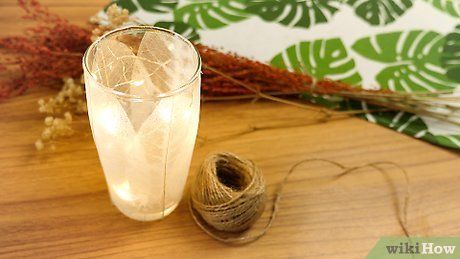Dán gân lá lên cốc nến hoặc bình hoa thủy tinh. Lau sạch vật thủy tinh bằng cồn, sau đó dùng keo dán trang trí (như Mod Podge) để dán lên. Phết một lớp mỏng keo dán trang trí lên mặt sau của lá, sau đó dán lên vật thủy tinh. Phủ một lớp keo cuối cùng lên lá.