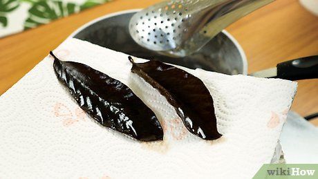Phương pháp làm khô lá. Đặt lá giữa 2 tờ khăn giấy và chèn một số sách nặng lên trên. Khăn giấy sẽ hút ẩm và sách sẽ giữ lá phẳng. Nếu muốn lá cong tự nhiên, bạn có thể để lá trên khăn giấy mà không chèn sách lên trên.