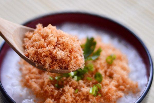 Ruốc cá hồi đã hoàn thành sẽ có màu vàng ngà, thịt bông xốp với hương vị ngọt đặc trưng. Bạn có thể kết hợp với cháo trắng, cơm rang, hoặc bánh mì phô mai để có món ăn ngon và bổ dưỡng.