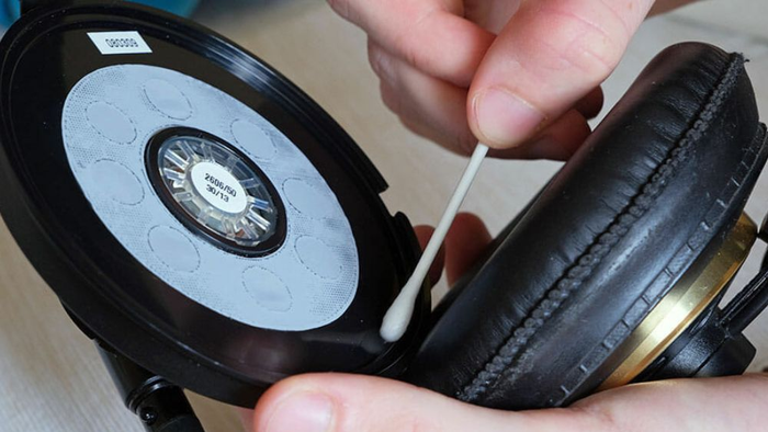 Dùng tăm bông để vệ sinh phần bề mặt tai nghe dính bụi bẩn.