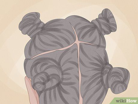 Twist tóc thành nhiều búi nhỏ. Chia tóc thành hai phần đều nhau, sau đó chia mỗi phần thành hai phần nhỏ. Sử dụng dây thun để cột từng phần, tạo bốn đuôi ngựa nhỏ. Lấy phần tóc bên trái ở phía dưới và twist nó giống như dây thừng. Twist cho đến khi tóc tự cuộn thành một búi. Sử dụng dây tóc hoặc kẹp để giữ búi tóc. Làm tương tự với phần tóc bên phải ở phía dưới và hai phần tóc ở phía trên.