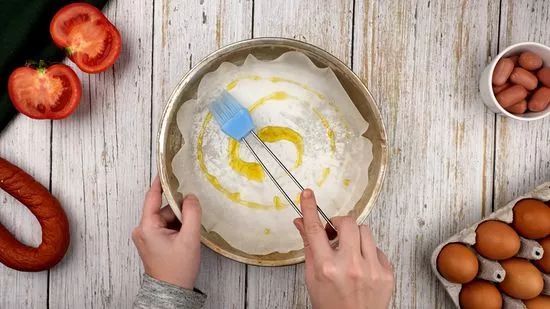 Thêm một chút dầu ô liu lên khay nướng và đặt xúc xích vào.