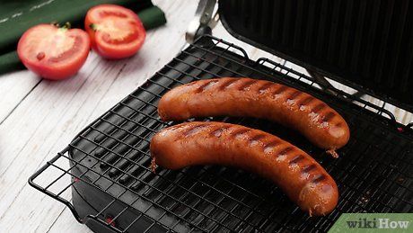 Nướng xúc xích 15 phút trên vỉ nướng đậy nắp, lật xúc xích một lần khi nướng được nửa thời gian.