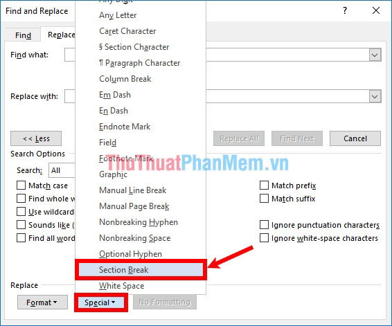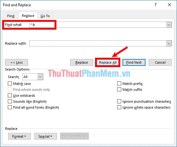 Bước 3: Trong phần Tìm kiếm sẽ hiển thị biểu tượng ^b, trong phần Thay thế bằng trống, nhấn Thay thế tất cả để loại bỏ hết Section Break.
