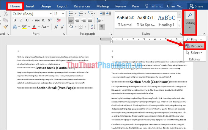 Bước 1: Trên tài liệu Word, bạn vào Tab Home -> Mục Editing -> Tìm và Thay thế hoặc nhấn tổ hợp phím Ctrl + H.